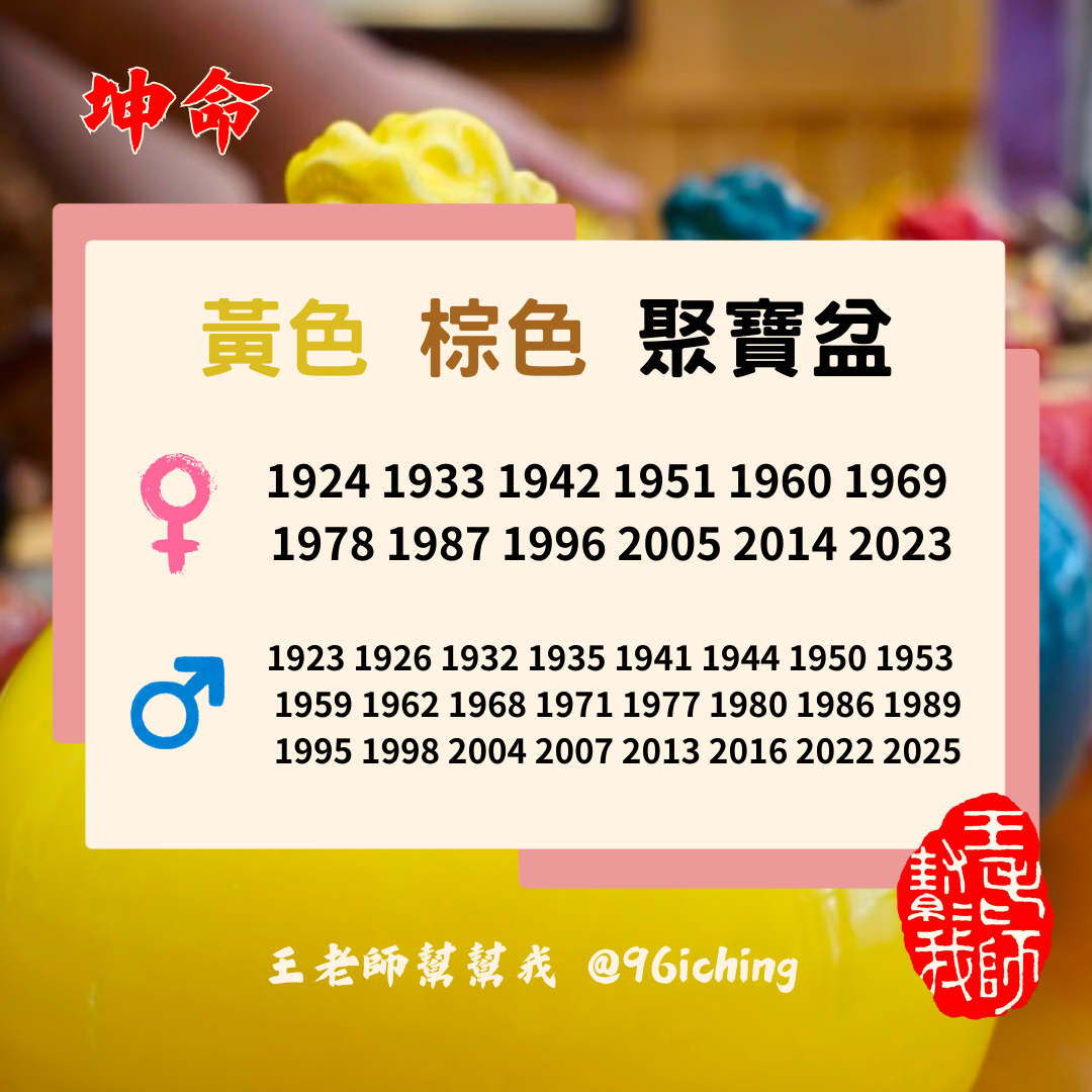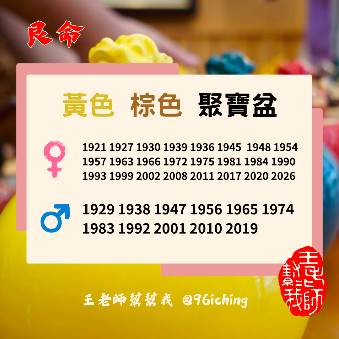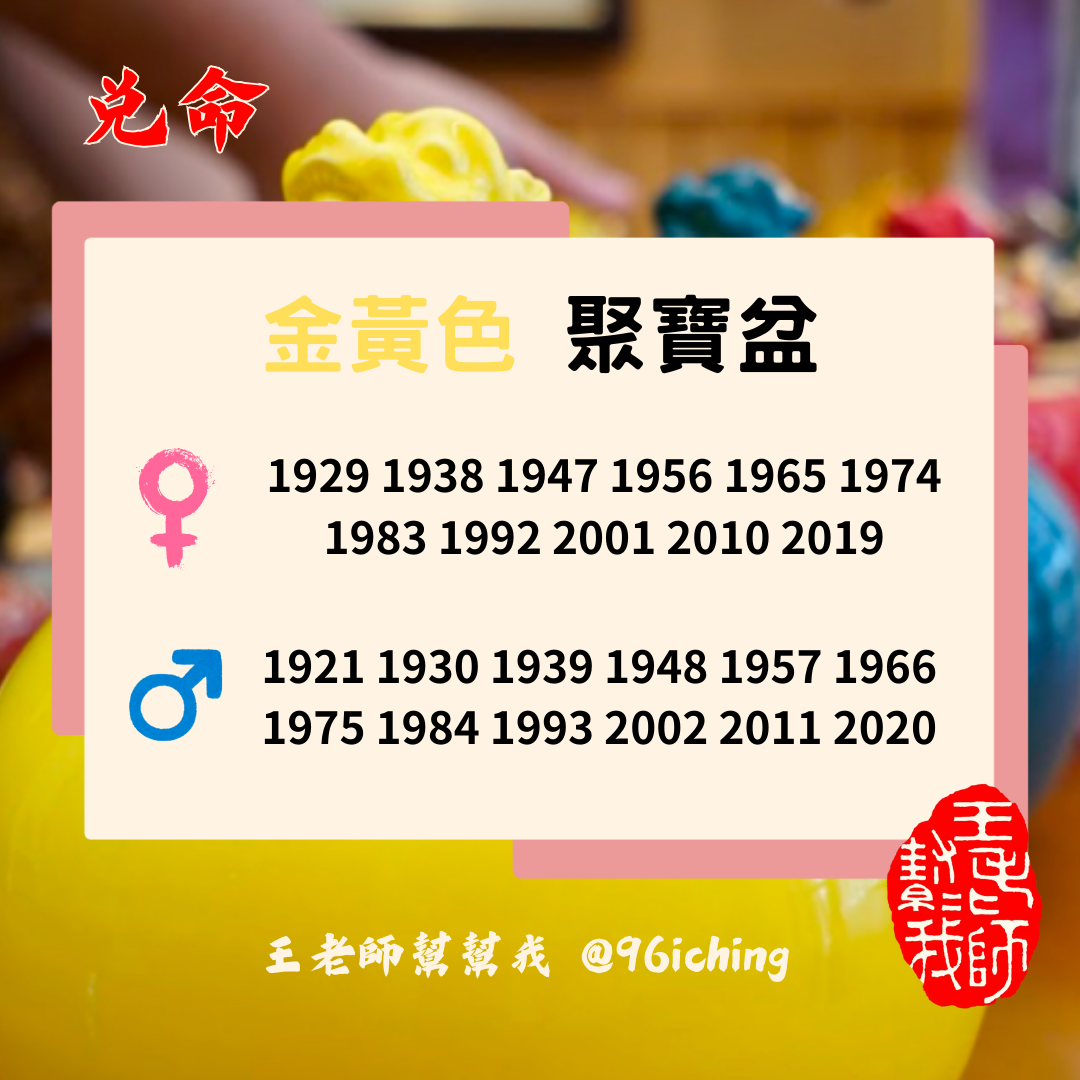 您可以查下方的表,找到自己出生的年份,即可得到您的五行命格,以及適合您的聚寶盆顏色。