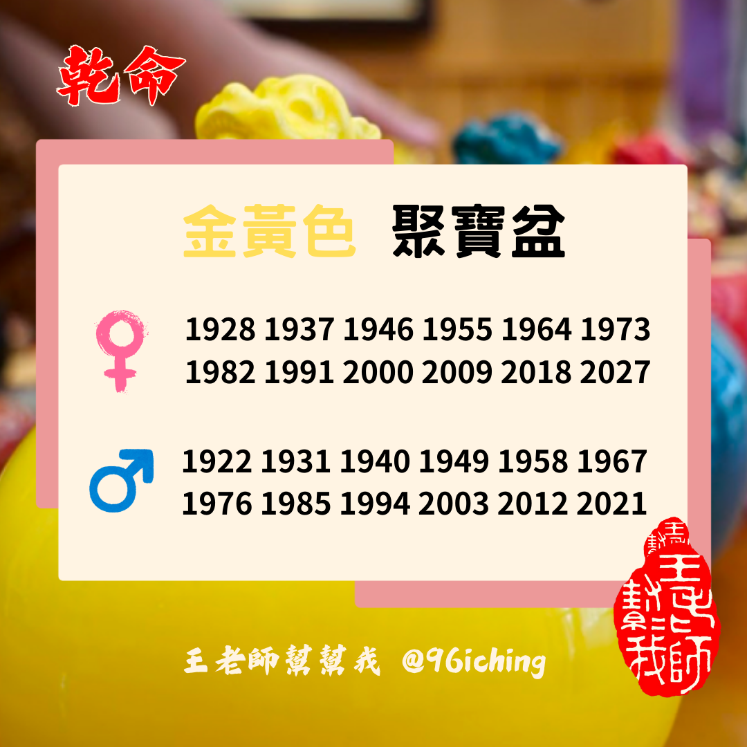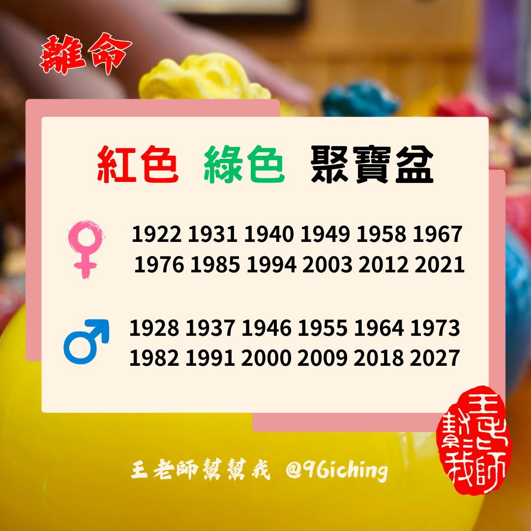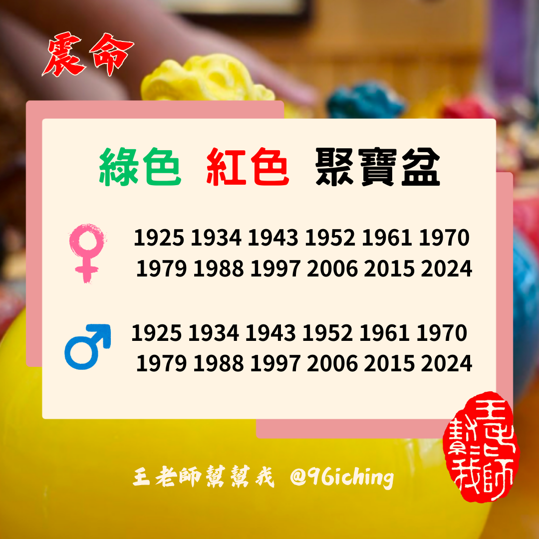 您可以查下方的表,找到自己出生的年份,即可得到您的五行命格,以及適合您的聚寶盆顏色。