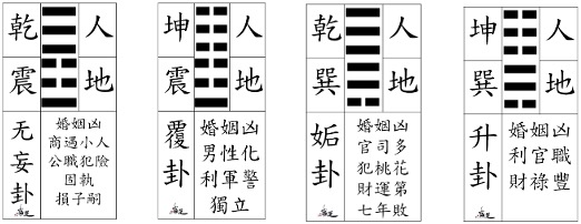 男主人為『乾』、女主人為『坤』,男主人乾巽組合為『姤』卦,女主人坤巽組合為『升』卦。