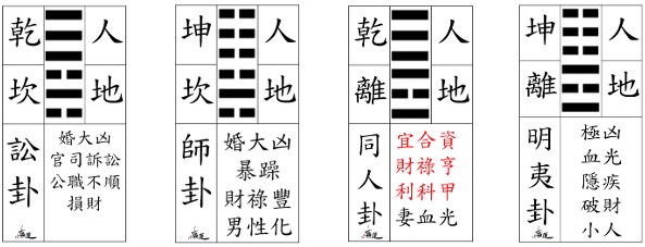 男主人為『乾』、女主人為『坤』,男主人乾坎組合為『訟』卦,女主人坤坎組合為『師』卦。