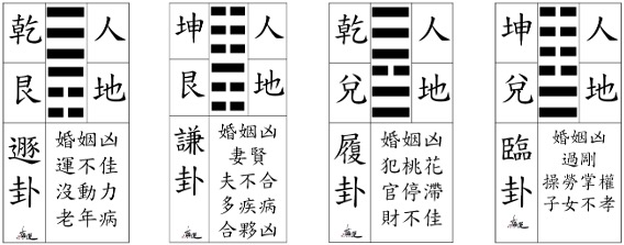 男主人為『乾』、女主人為『坤』,男主人乾艮組合為『遯』卦,女主人坤艮組合為『謙』卦。