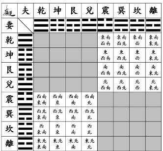 3. 如果夫妻同為東四命或西四命那問題就不大,因為吉凶方向相同,但是夫妻的命宮組合有8x8=64種組合方式,其中夫妻不同卦有32種組合,床向又有8個方向,所有可能性有8x8x8=512種可能結果。