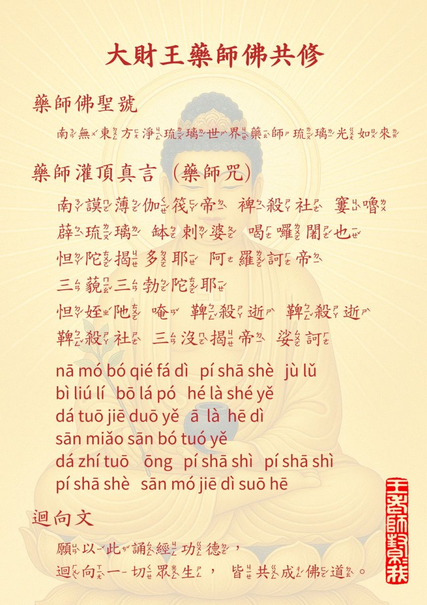 解說:早上起床可以持誦『藥師灌頂真言』、或持『藥師佛聖號』,藥師佛是佛教中的大財神,ˇ能助你穩定心境,提升財運能量。