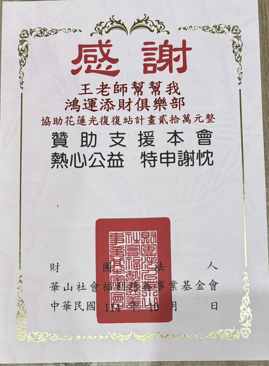 為了回饋社會、實踐福德善行,王老師團隊已完成對花蓮地區的善款捐助。除了本次中秋節法會參與人數 2,400 人的 5%(共 12 萬元)之外,團隊特別將捐款金額 提升至 20 萬元整,希望能在天災過後,為受災地區的重建與民眾安穩盡一份心力。