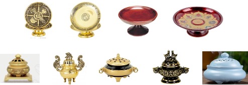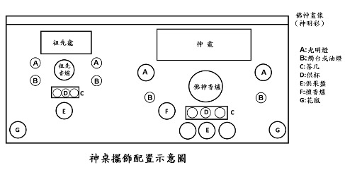 1. 光明燈(A):置於神龕及祖先龕前方兩側,如果因為場地限制只能放置一對,則放置神龕兩側而非放置神龕及祖先龕前方左右各一隻。